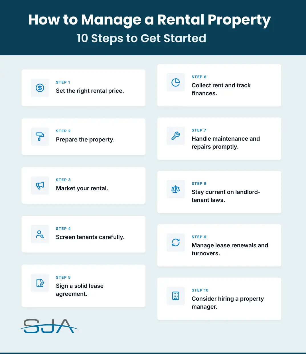 Step 6: Collect rent and track finances. Set up a reliable system for collecting rent and tracking income and expenses. This makes tax time much easier. Visit our Property Manager Tax Deduction Tips to make sure you are capturing every deduction.