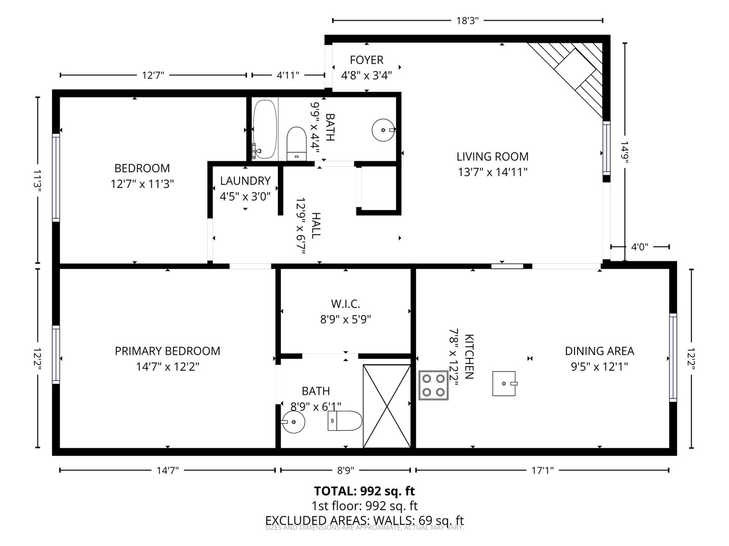 The kitchen offers ample storage and a dedicated dining area. The spacious primary bedroom includes a walk-in closet and a private 4-piece ensuite bath. A generously sized second bedroom and full hallway bathroom provide flexibility for guests or a home office.