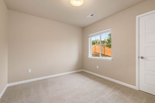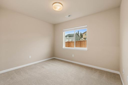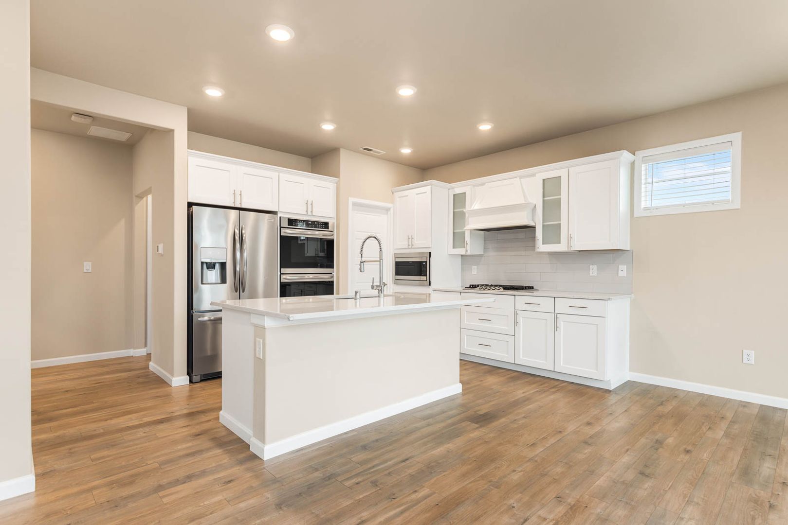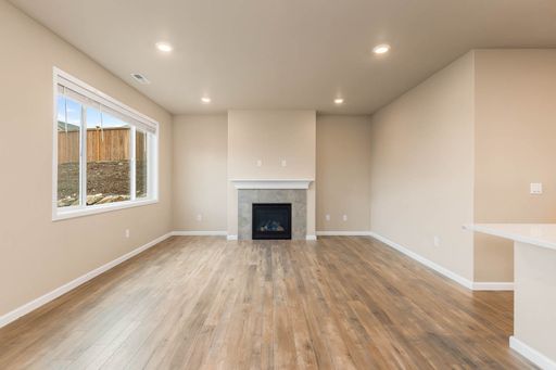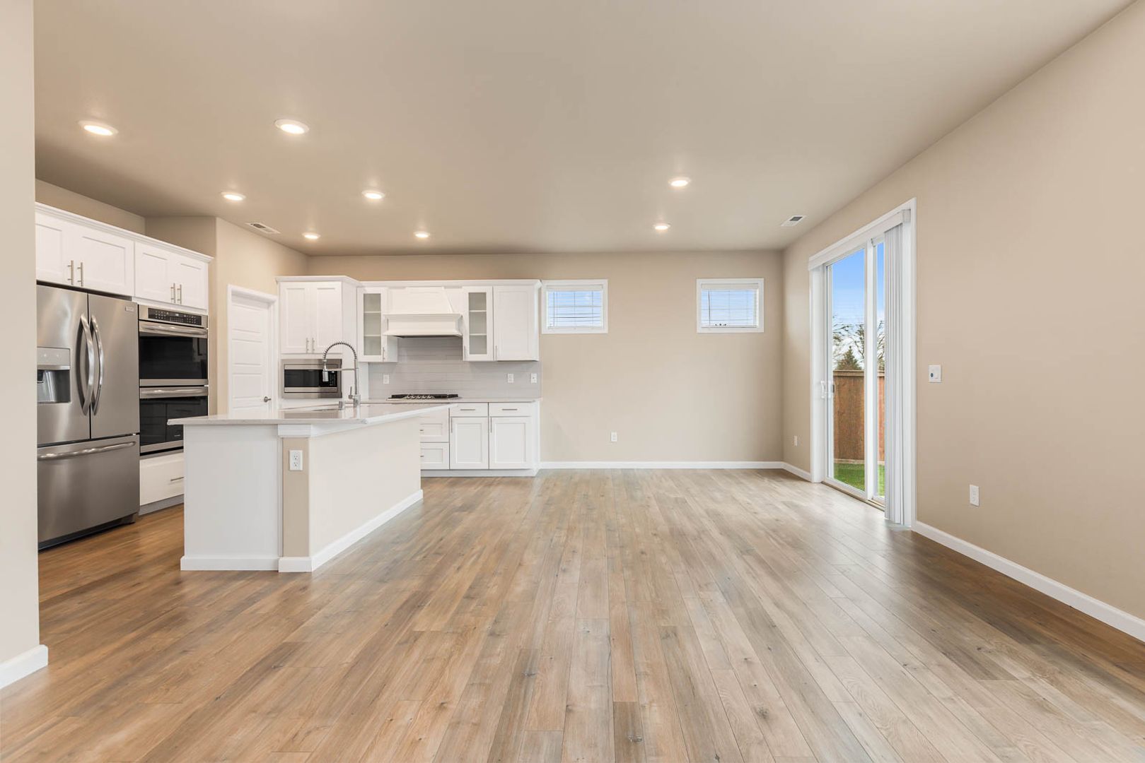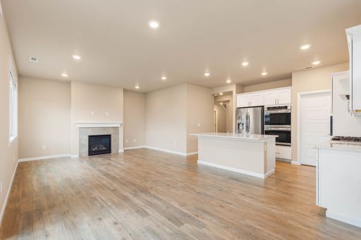 As you enter the home, you’re welcomed into a bright, open main living space designed for everyday functionality. The open floor plan connects the living area, dining space, and kitchen, with vaulted ceilings and large windows that allow natural light to flow throughout. The living area features a fireplace and sliding glass doors that open directly to the backyard, creating an easy indoor–outdoor connection. The kitchen sits at the heart of the main level and offers wood cabinetry, modern appliances, a spacious pantry, and a large island with an integrated sink, providing ample storage and workspace. This level also includes a dedicated office, offering flexibility for work or study.