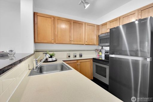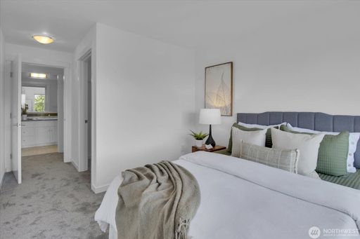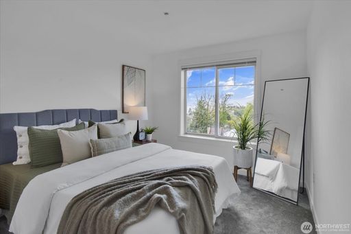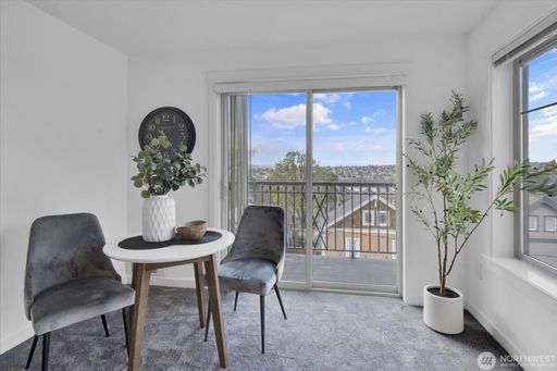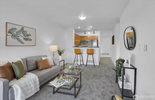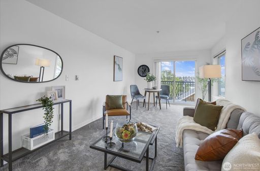 This light-filled condo features 2 spacious bedrooms and 2 full bathrooms, a rare find in the area. Brand new carpet, paint and washer/dryer. Enjoy beautiful mountain, territorial, and Sound views from your private retreat in a well-maintained boutique building.