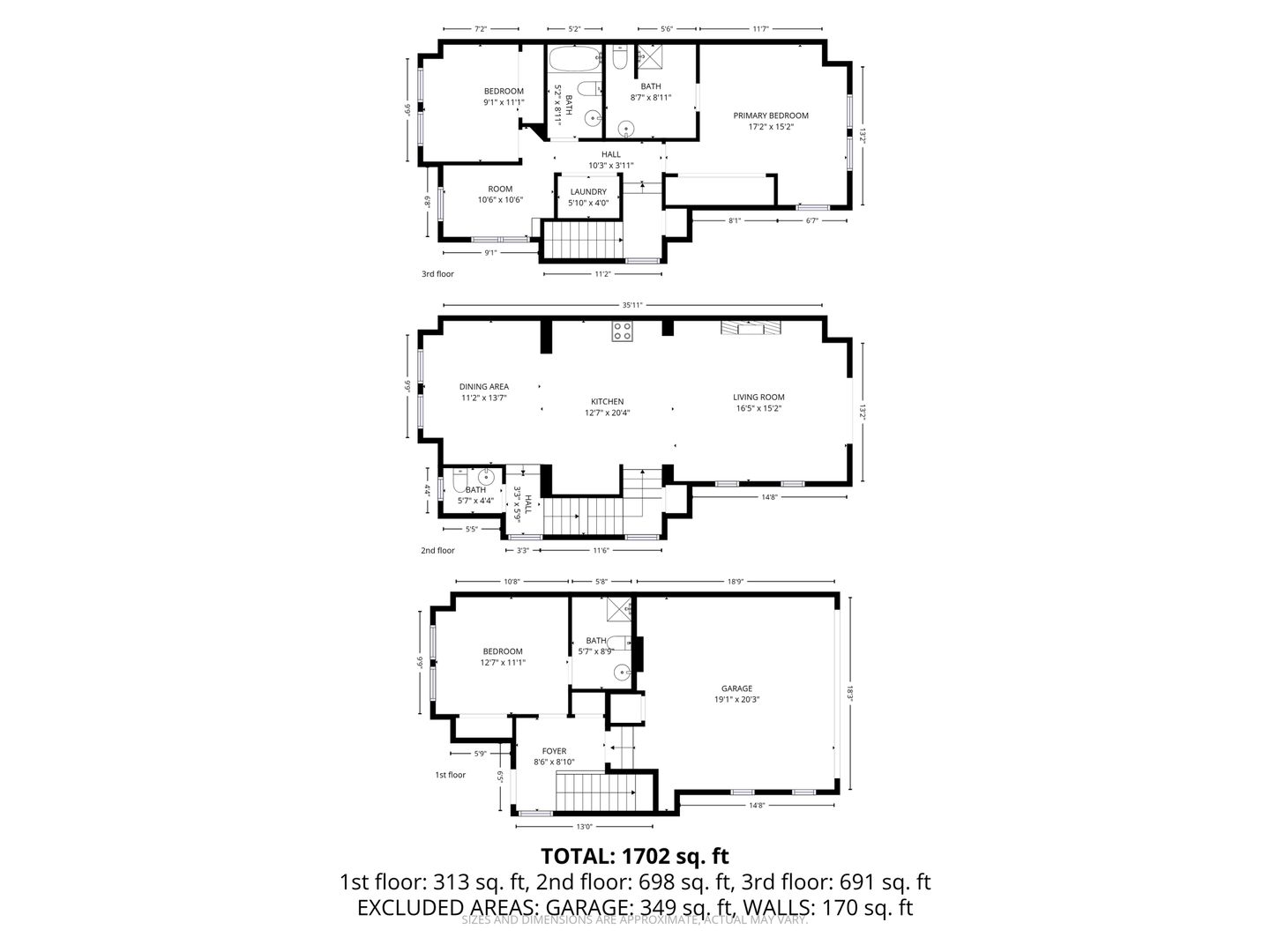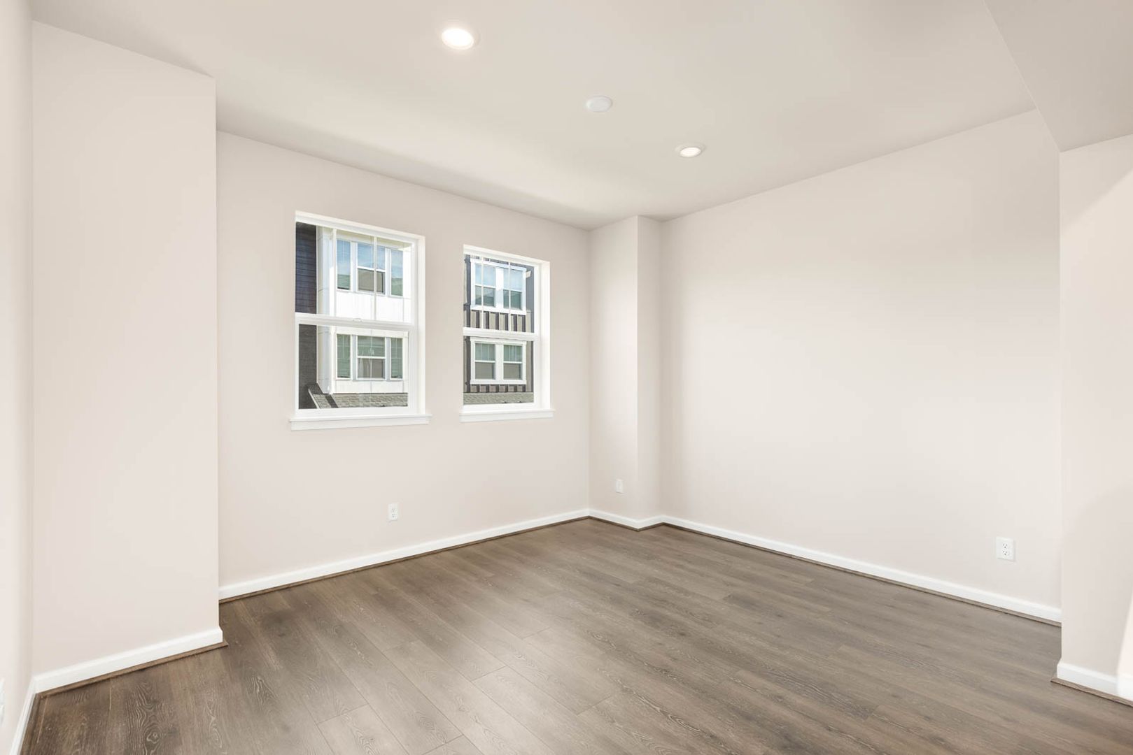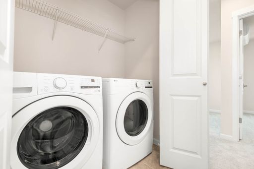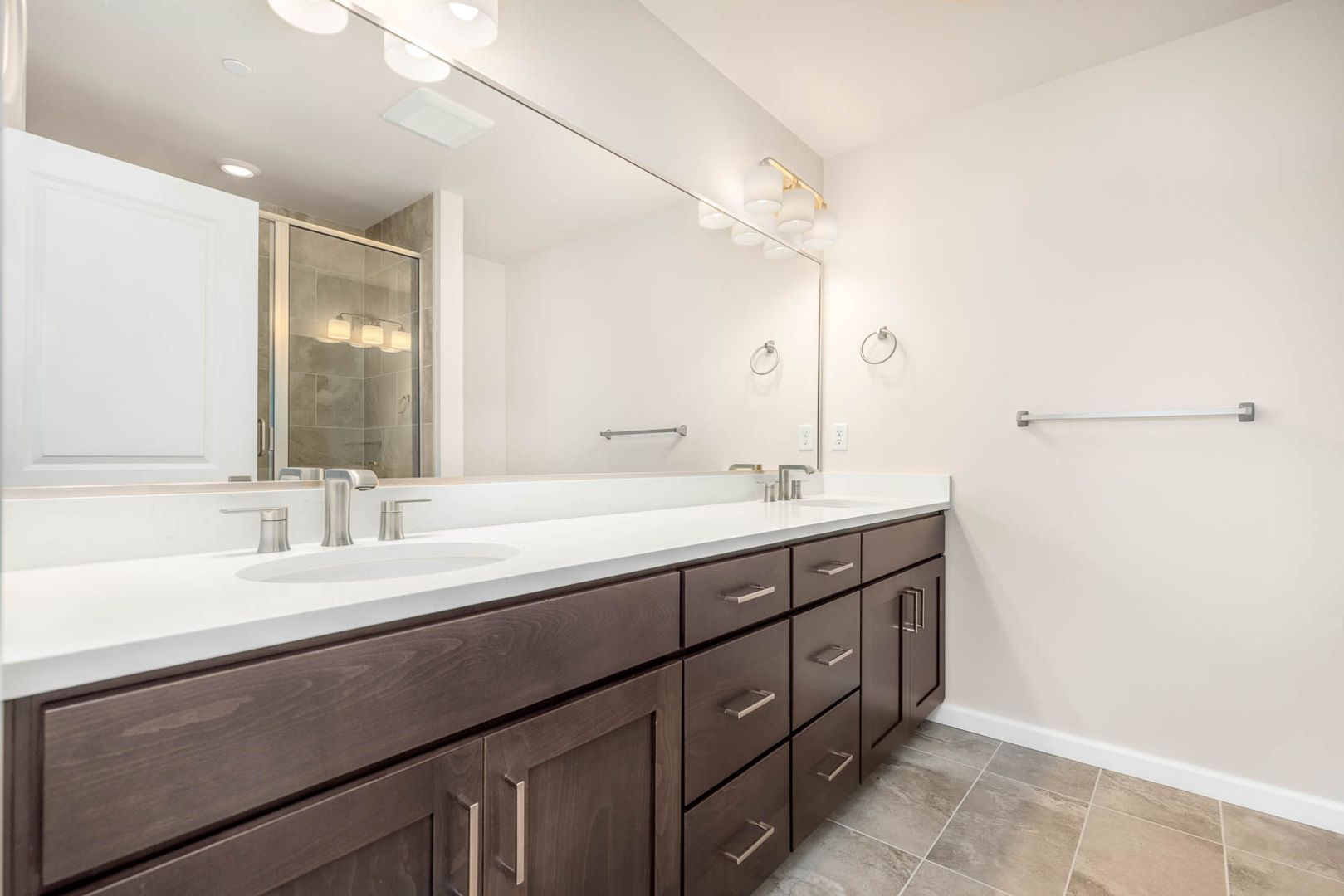 The third floor is designed for comfort and privacy. The primary bedroom features carpeted flooring, a closet, great natural light, and a mini split system. The primary bathroom includes a double vanity, large mirror, and walk-in shower. This level also includes a secondary bedroom with carpet, closet, and good natural light, a full hallway bathroom with a bathtub, a carpeted open space, and a double-door laundry area conveniently located off the hallway. Additional carpeted stairs and hallway storage add even more functionality.
