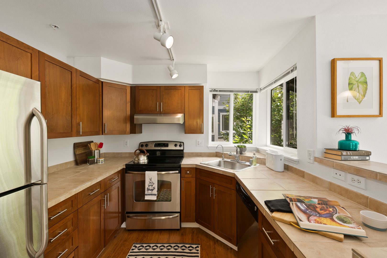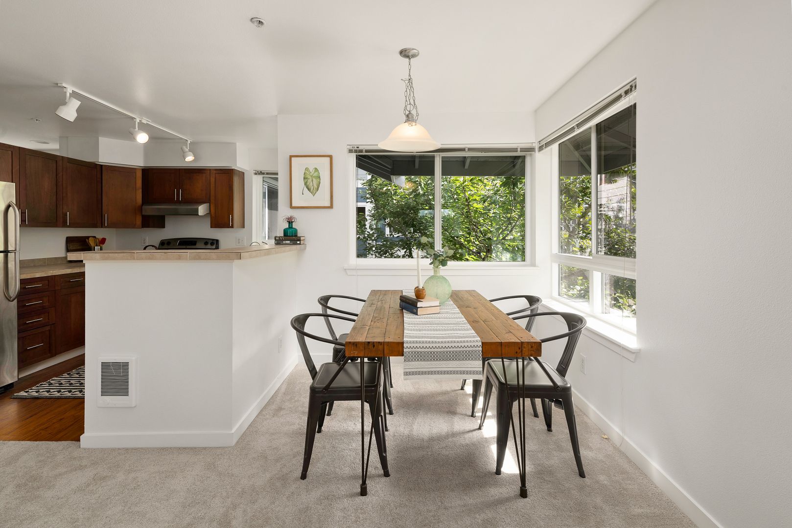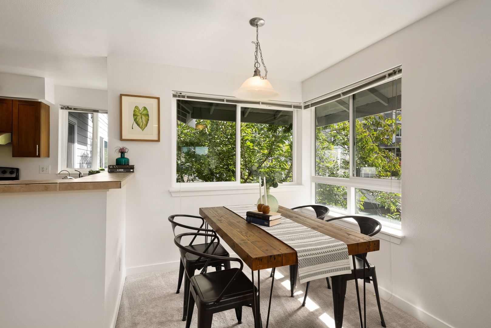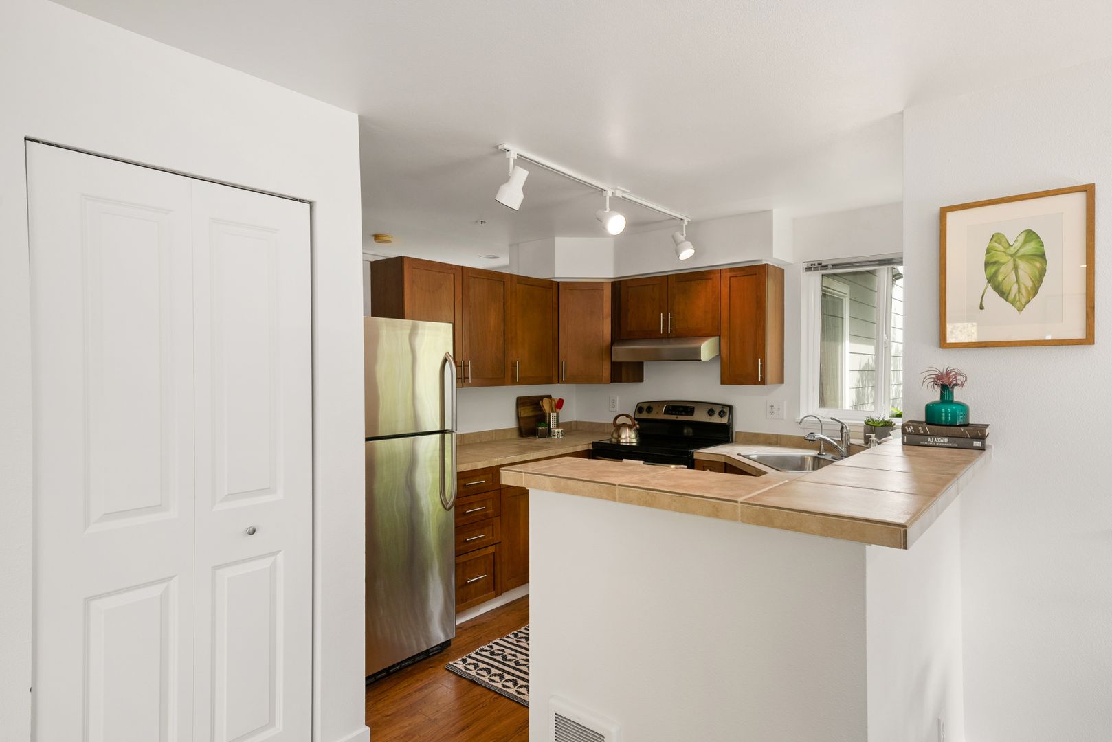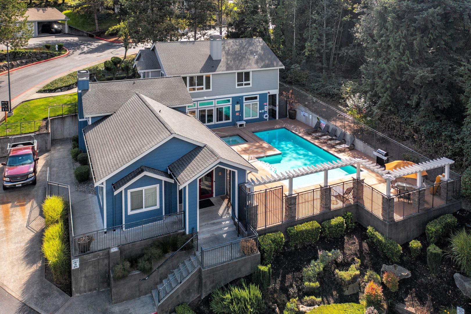 SJA Property Management proudly presents this top-floor corner unit, you’re greeted by an open concept floorplan, sun-filled west & south facing windows w/ treetop & sunset views! A wood-burning fireplace adds a cozy ambiance to the living room as it flows to the dining area & kitchen with stainless steel appliances. 2 generous-sized beds w/ walk-in closets, a spacious bathroom, & a separate laundry full-size washer/dryer. The large west-facing front deck is perfect for entertaining or a place to enjoy the expansive sunset views. Park in your private individual garage or uncovered parking spot. On-site amenities include a clubhouse, outdoor pool, hot tub, gym, & playgrounds.