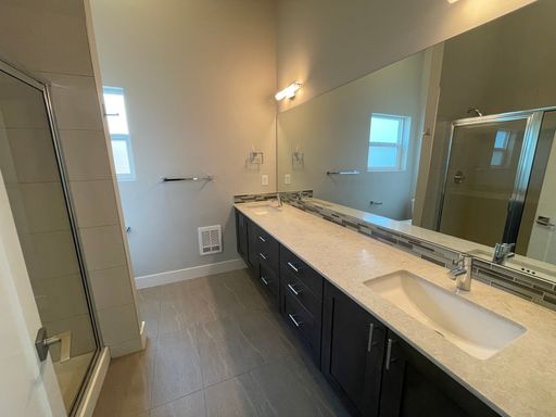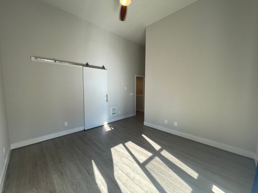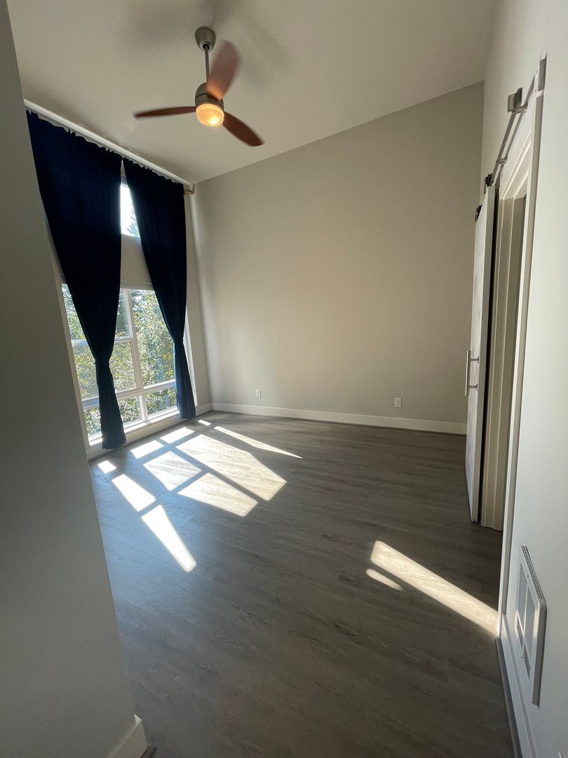 Upstairs, you’ll find a generous secondary bedroom with soaring ceilings, a full bath, and a convenient laundry area. The primary suite is a true retreat with abundant natural light, a walk-in closet with barn door, and a spa-inspired ensuite featuring double sinks and a spacious walk-in shower.