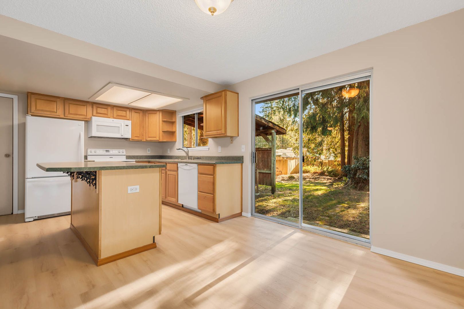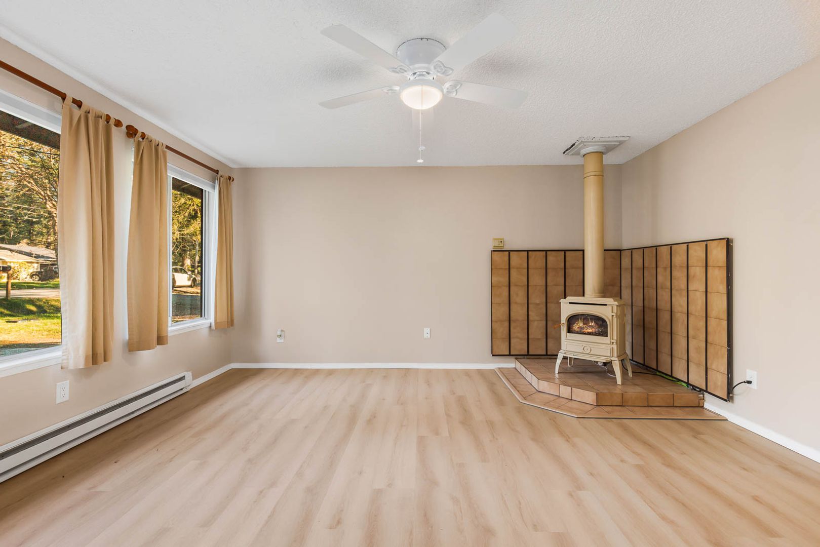 The open living area features large windows with views of the front yard, a cozy fireplace, a ceiling fan, and durable vinyl flooring, creating a welcoming space for everyday living. The kitchen is both practical and inviting, offering wood cabinetry, a center island, double sink, and a sliding door that opens to the large backyard. The kitchen also provides direct access to the garage for added convenience.
