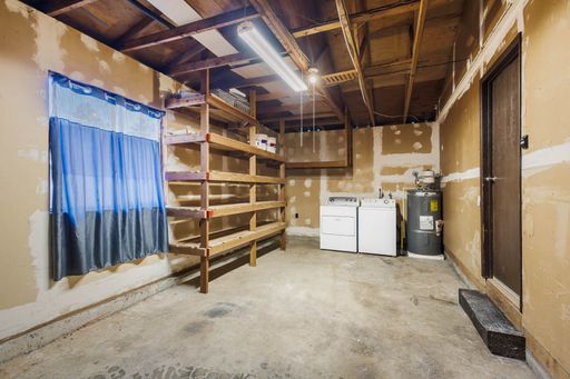 The garage includes a washer and dryer along with additional storage space. A hallway storage closet with sliding doors adds even more functionality. The bathroom is well-lit and features a bathtub with a shower wand and a storage closet.