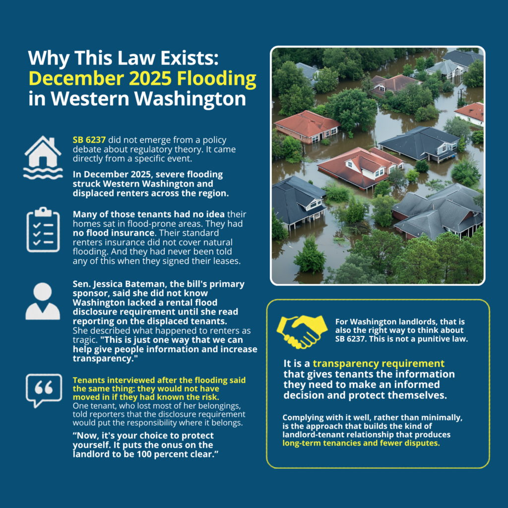 Disclaimer: This article is intended for informational purposes only and does not constitute legal advice. SB 6237 was signed by Governor Ferguson in 2026. The flood disclosure requirement applies to leases signed after December 31, 2026. Confirm current requirements and appropriate lease language with a qualified Washington State attorney before updating your rental agreements.